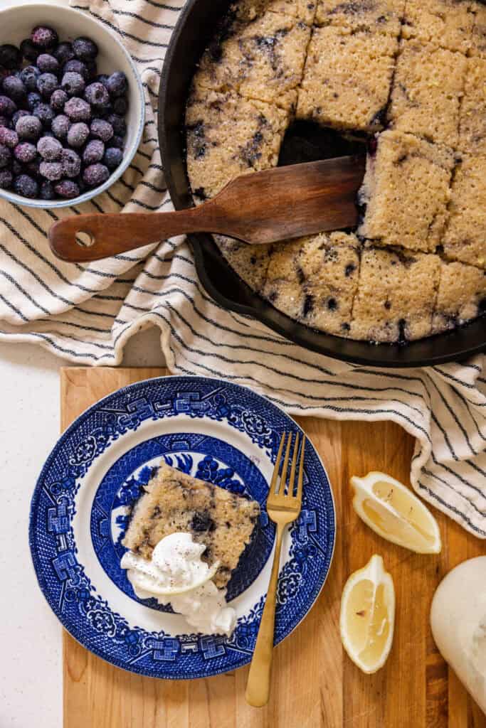 Next day, add in your egg and lemon zest to the batter, mixing well. Set it aside and get started on the blueberries. In a 10″ cast-iron pan, heat some butter on medium heat and add your blueberries. Let them heat gently for about 5-10 minutes, stirring every minute or so. Turn the heat off, pour your batter over the blueberries and bake for 15-18 minutes.