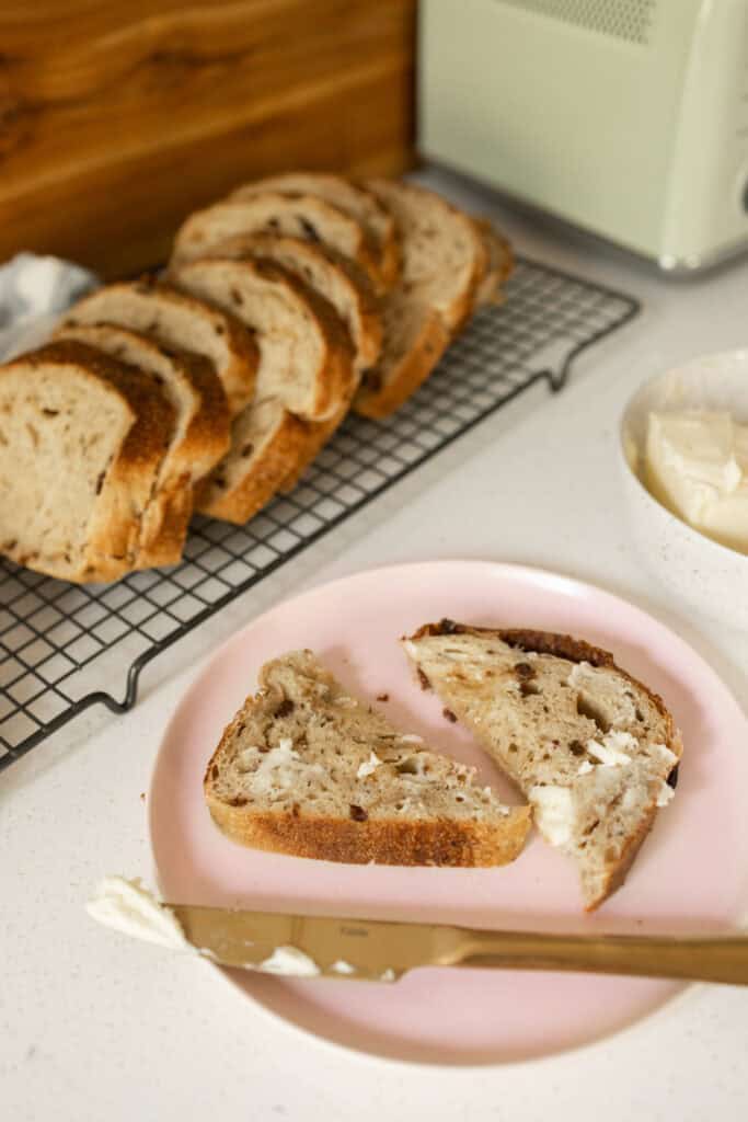 If you are looking for a gut friendly alternative to store bought raisin bread, this will serve you well. It is made the day before you are going to enjoy it and we use bubbly active sourdough starter to help ferment the grains, benefiting your body in many ways!