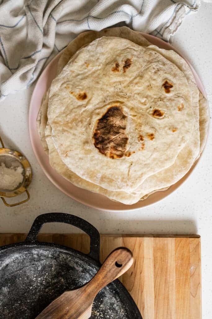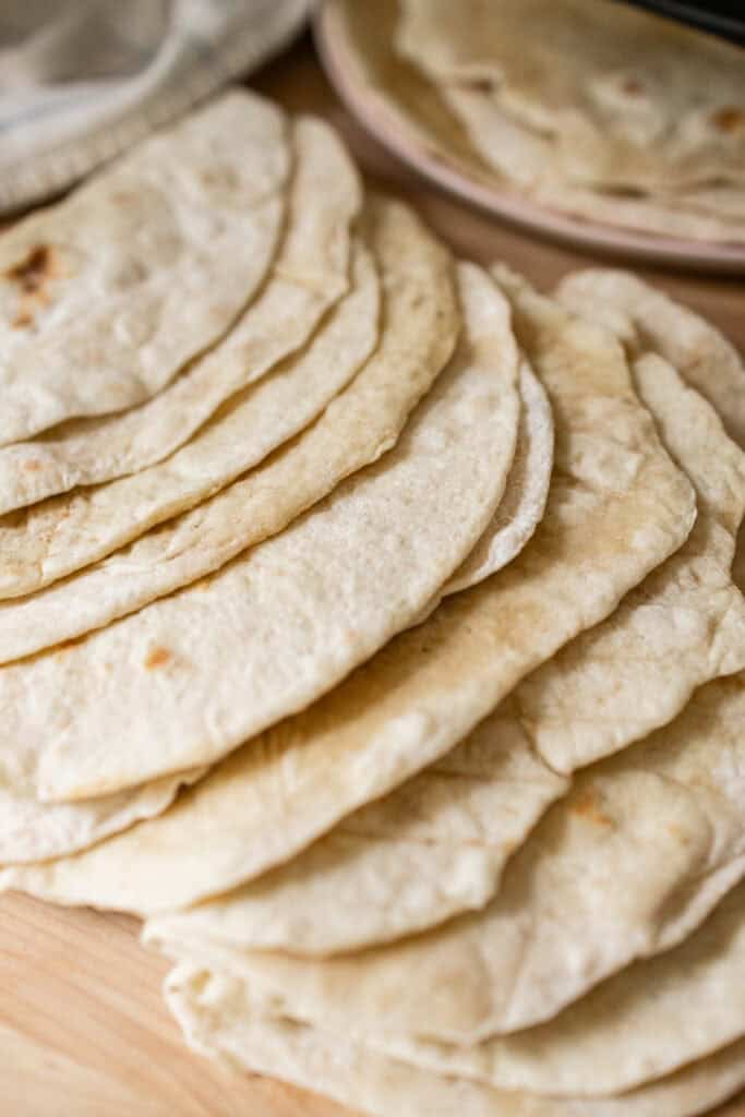 - On a floured surface, use a rolling pin to roll your dough piece thin. I make my tortillas about 9″-10″. Use lots of flour on the counter and on top of the dough if it really starts sticking. Take your tortillas and place it on the hot pan and cook until it bubbles. Flip and continue to cook the other side. When finished cooking each tortilla, place on a plate under a very damp towel. This will stop it from drying out!