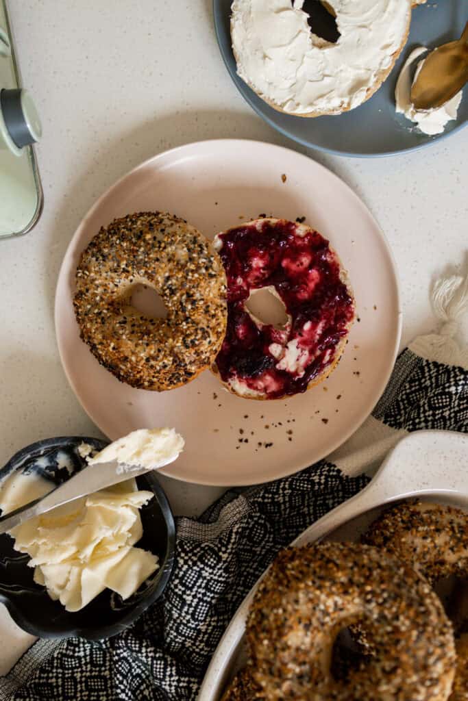 Grab your favorite cream cheese and make a batch of jam! These bagels are chewy, soft and so good for you, thanks to the wonder of sourdough. It took me a hot minute to create a recipe for homemade sourdough bagels that was simple and used less than 10 ingredients. This recipe only uses 5 ingredients for the dough itself and few extra for boiling our bagels and dressing their tops. These don’t last more than a day in our house.