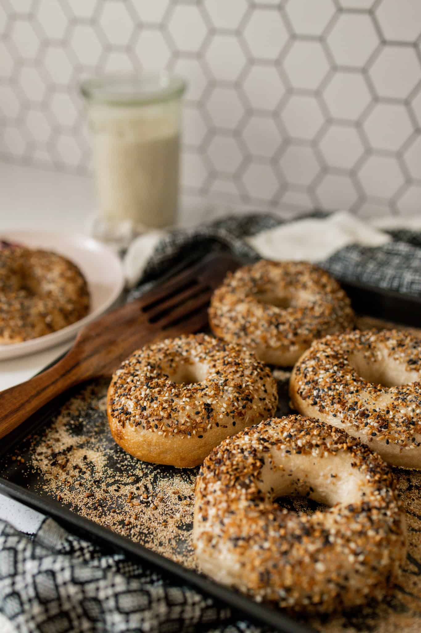 - Remove the bagels using a small sieve or a spoon with holes in the bottom to drain extra water. Place onto your baking sheet and sprinkle on any desires toppings such as flakey sea salt or everything bagel seasoning or leave them plain. Repeat to all the bagels.