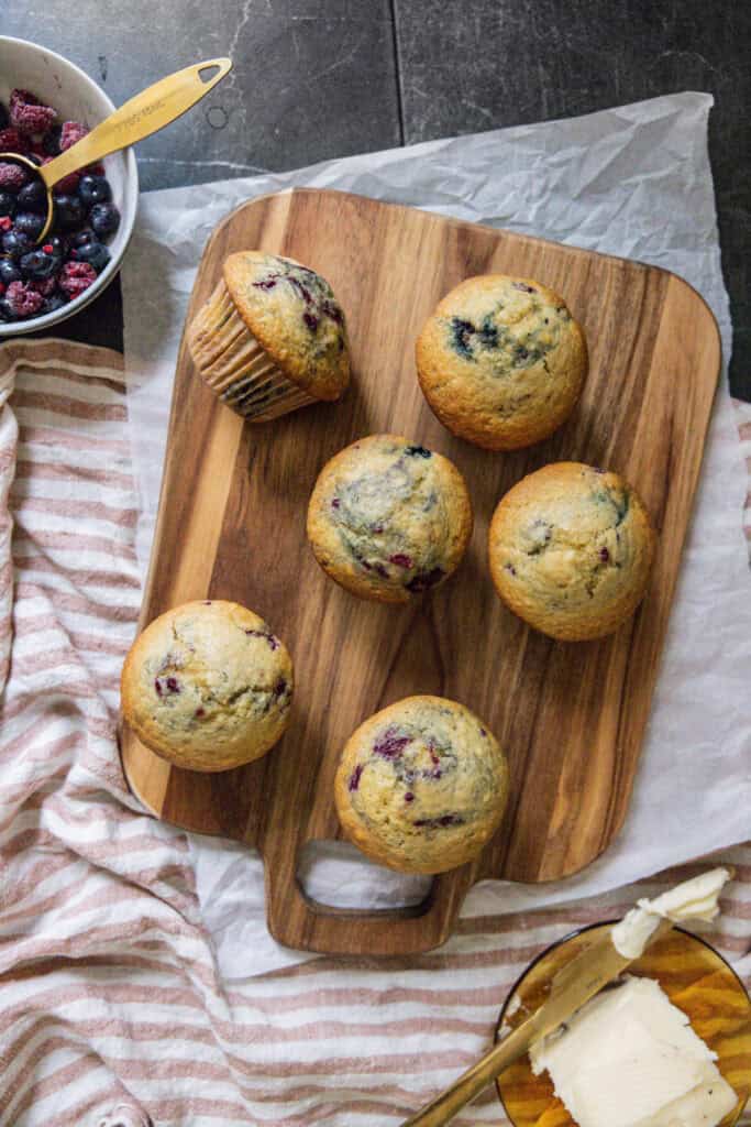 The berries in these muffins can easily be changed out for small cherries, chopped strawberries or dried cranberries too!