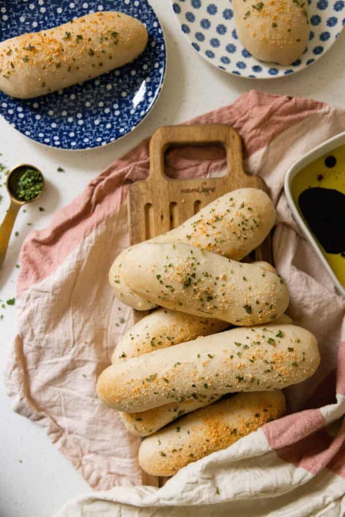 If you like smaller breadsticks, make 20 breadsticks from this recipe instead of the 12 and roll them to be quite skinny. This recipe does yield a larger, puffier breadstick. We also enjoy making these breadsticks unique looking by twisting or braiding the dough before our final bake!