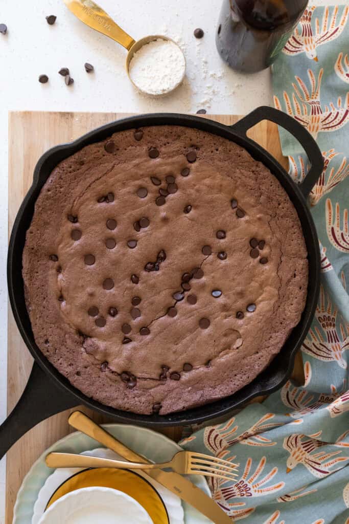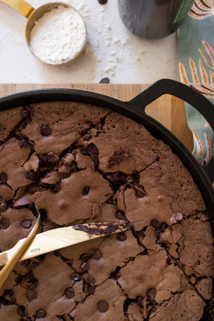 - Prepare your pan (I use a 10โ cast iron pan) by greasing it well or lining it with parchment paper. Pour your batter in and smooth it down using the spatula. Sprinkle some chocolate chips on top.