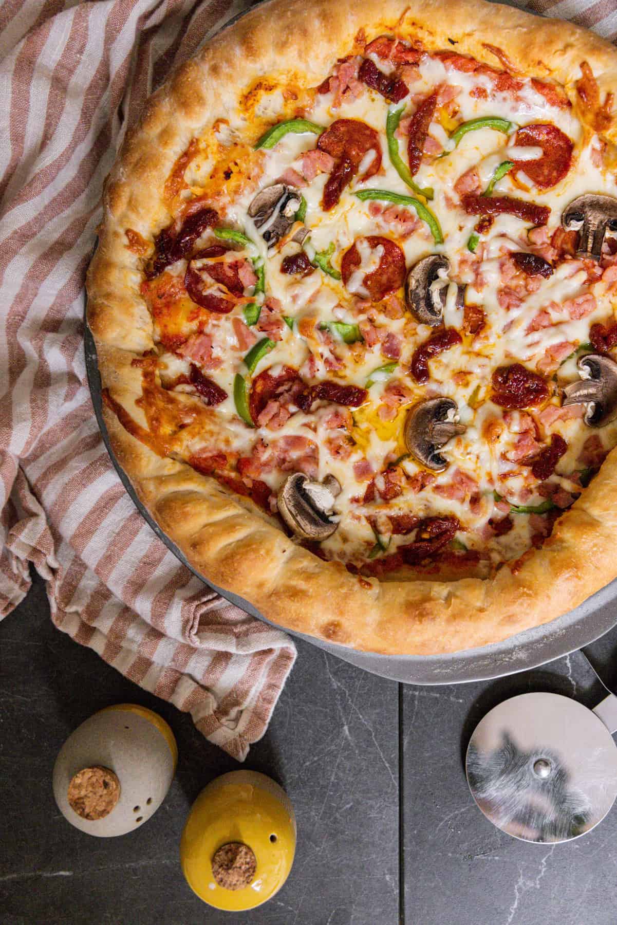 Place your dough gently onto a greased pizza pan. Bake for 8-10 minutes without the toppings.